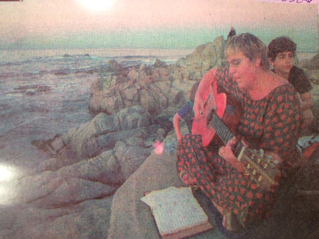 In 1997 I was in Pacific Grove with my two sons visiting a friend. I was right on the sand, very close to him, when his plane went into the water and he died. I chanted for his future...for all his dreams to come to fruition...for him to accomplish all his goals in his eternal life. And that night...as I was at the ocean playing and singing for him, I was filmed and photographed. I ended up singing for John Denver on the evening news as they announced his death. I sang for John Denver. And my picture was taken and went out on the AP wires. My boys and I were in color on the cover of the Denver Post newspaper, and many other places. Here's that picture: